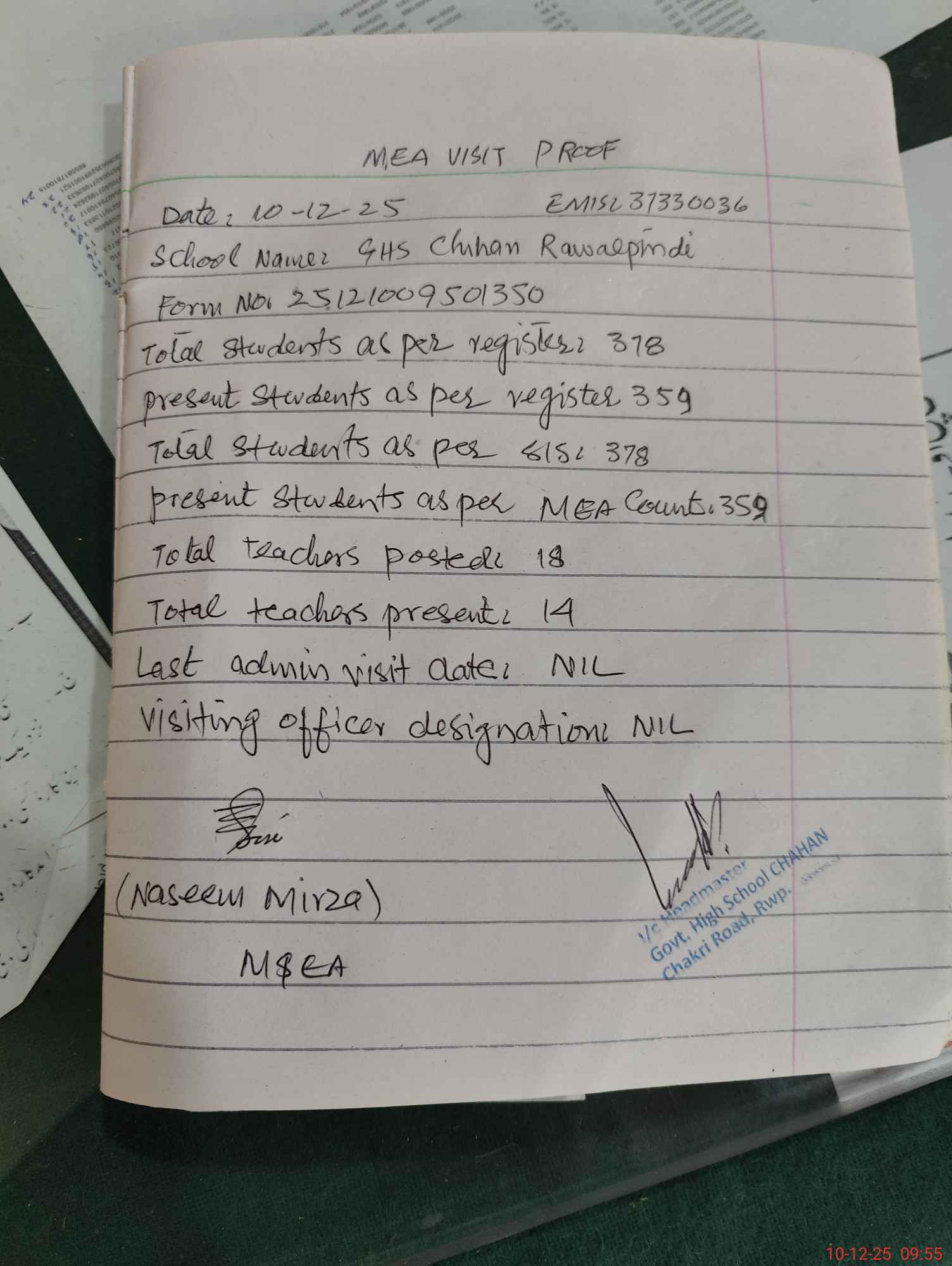 | Attendance Register | Head Teacher | MEA with School | Visit Proof |