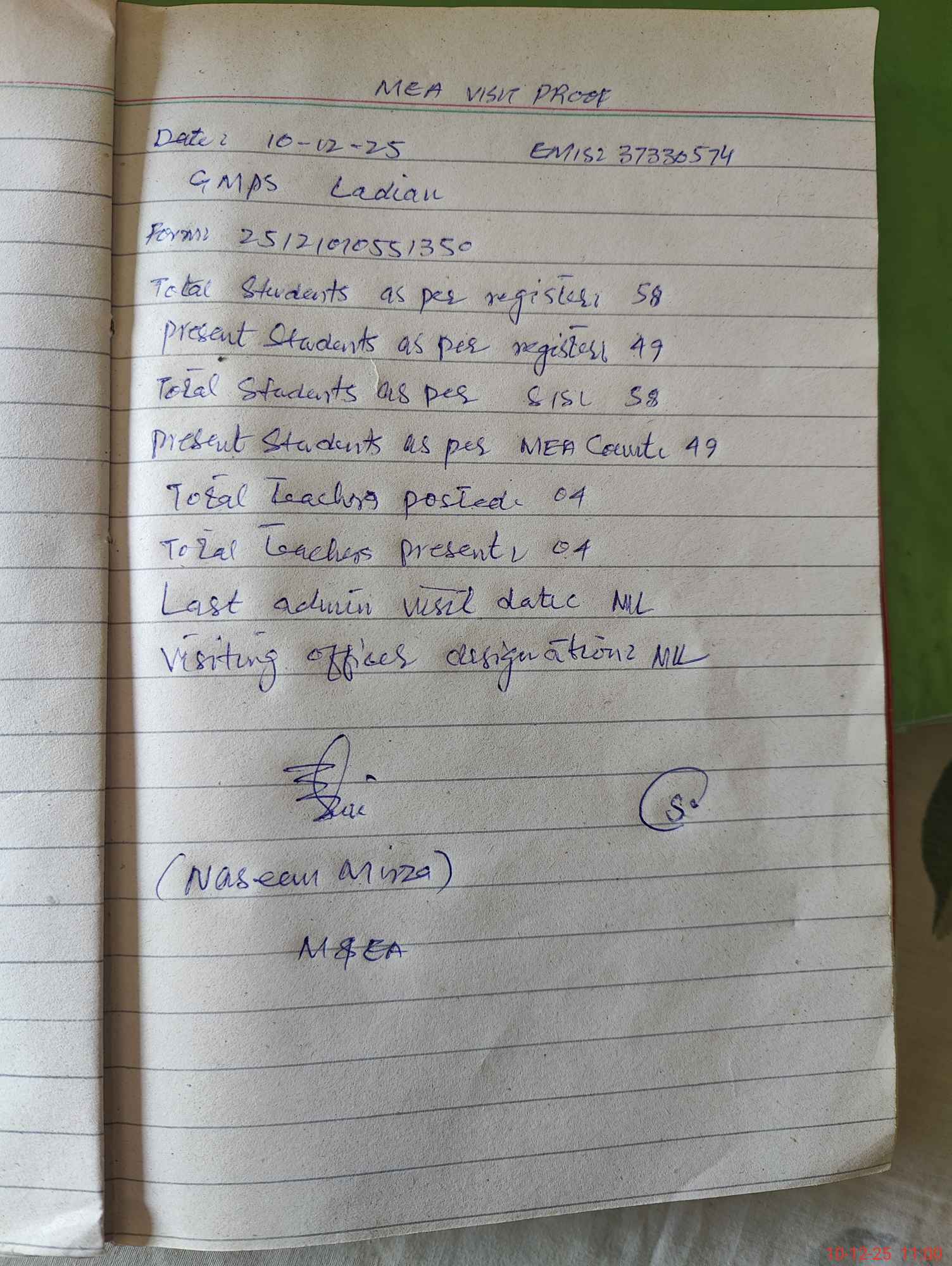 | Attendance Register | Head Teacher | MEA with School | Visit Proof |