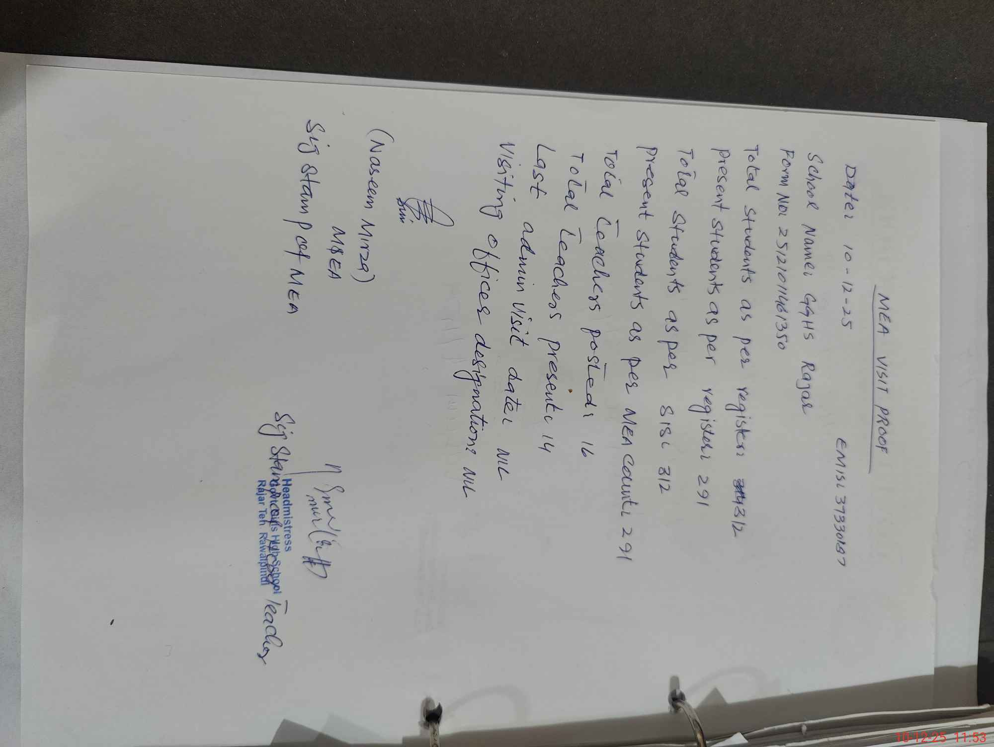 | Certified that this School was Inspected by the Undersigned MEA/DMO Today and the Information Stated Above is as Per Record. | |||||