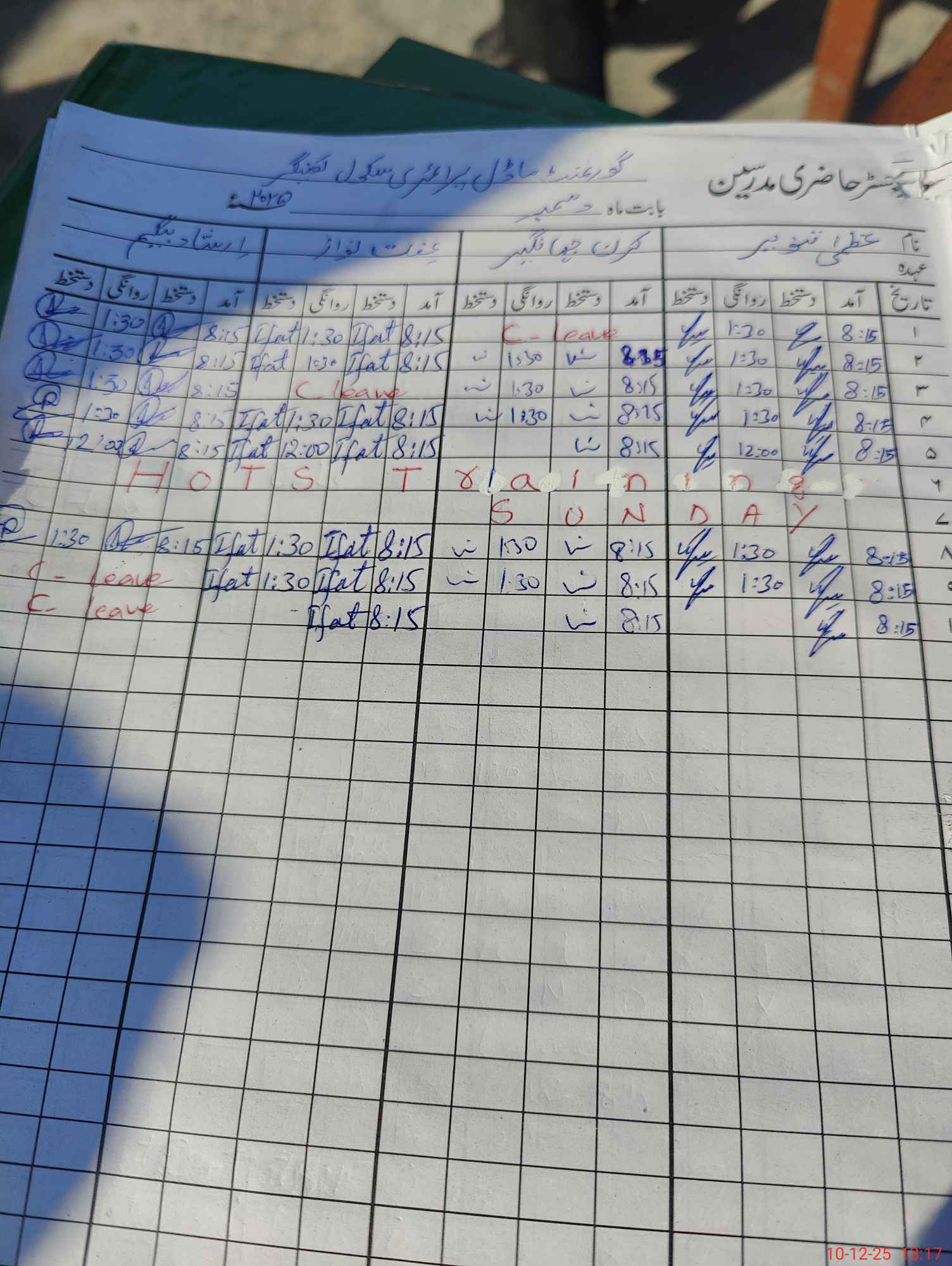 | CNIC | Full Name | Designation | R/C | Absence During Last Calender Month |