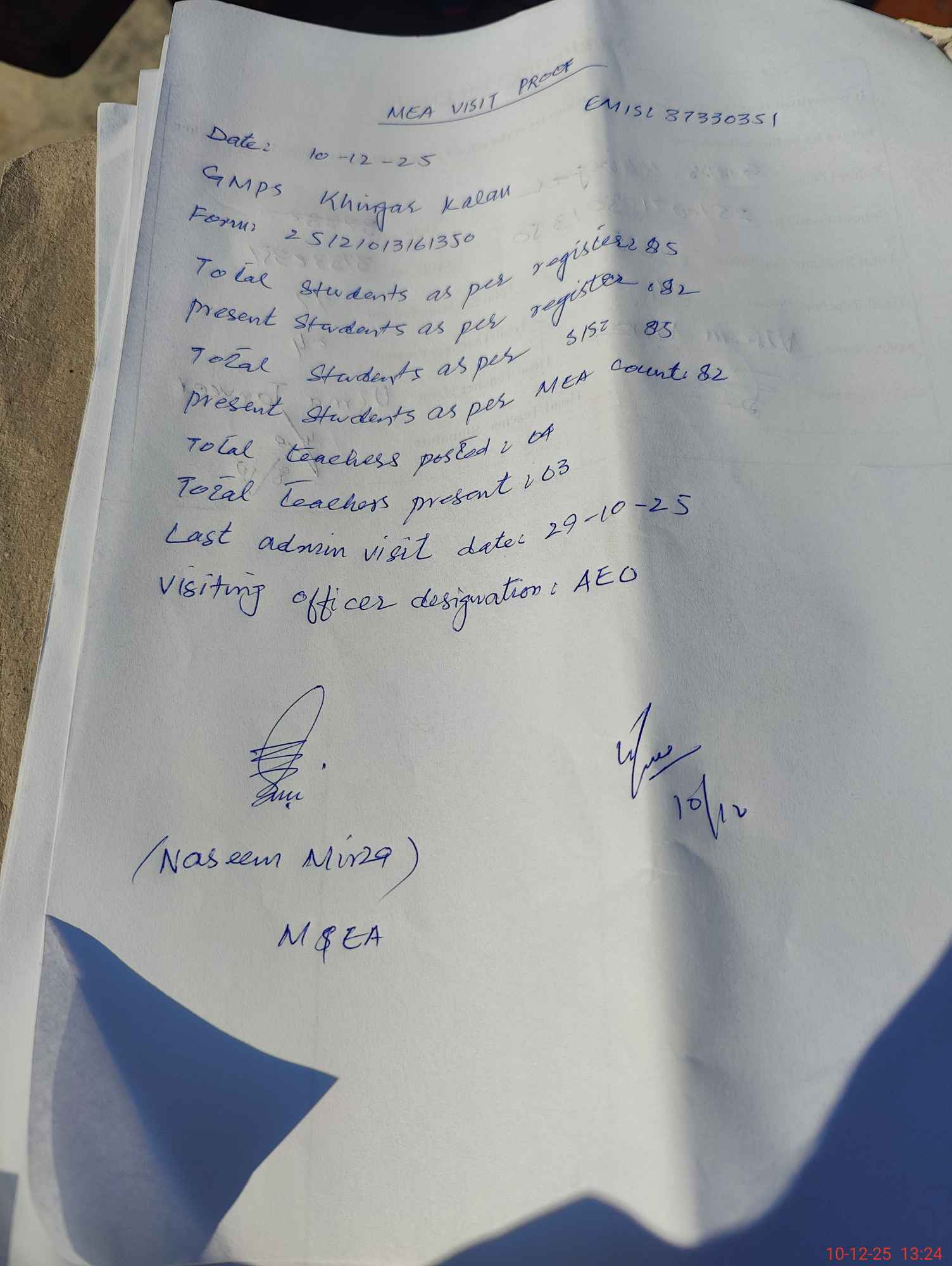 | Attendance Register | Head Teacher | MEA with School | Visit Proof |