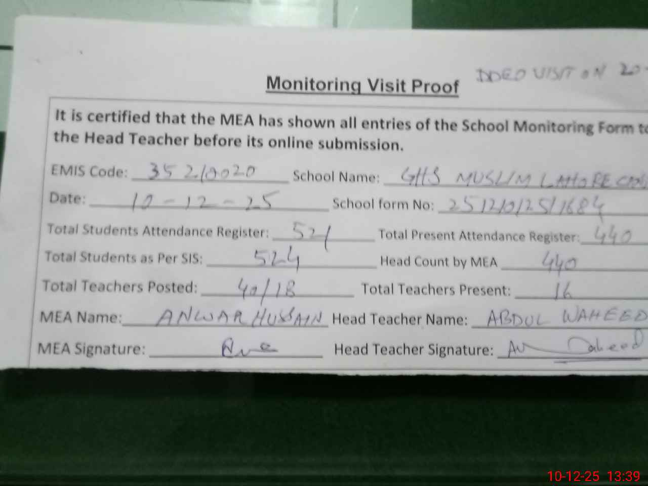 | Attendance Register | Head Teacher | MEA with School | Visit Proof |
