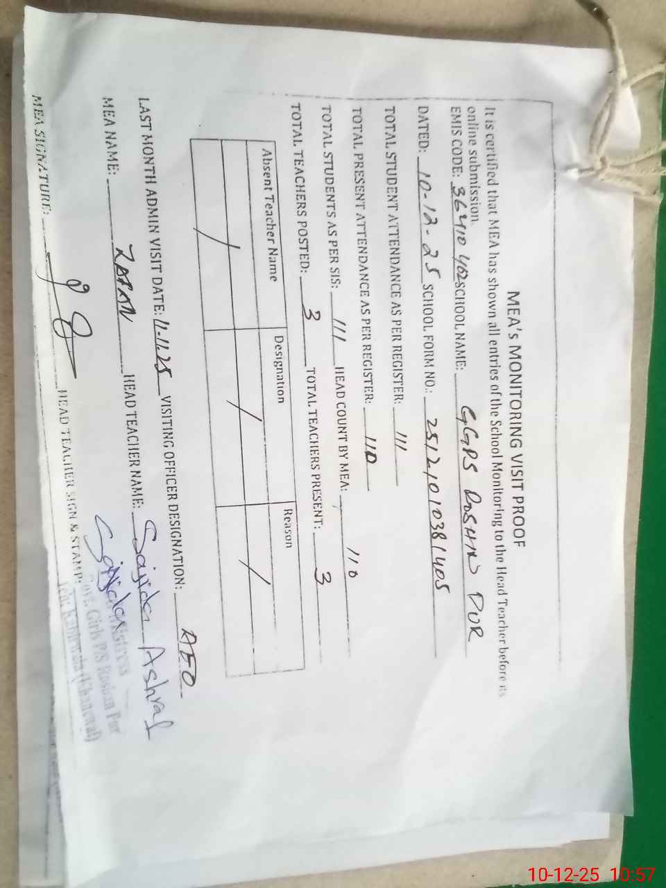 | Attendance Register | Head Teacher | MEA with School | Visit Proof |