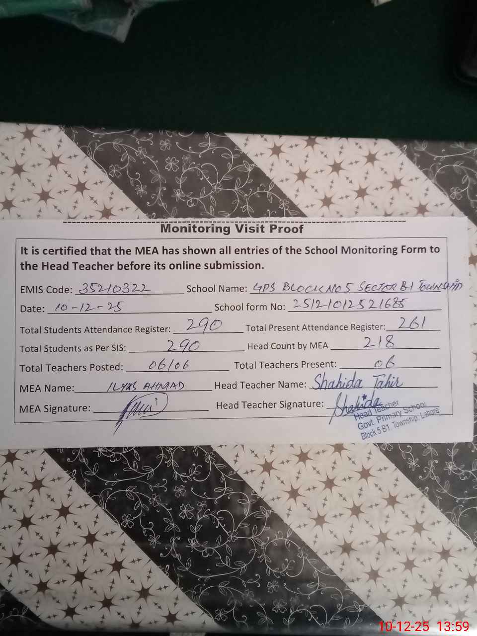 | EMIS Code: 35210322 | Name of School: GPS BLOCK NO. 5 SECTOR B-I TOWNSHIP | |||