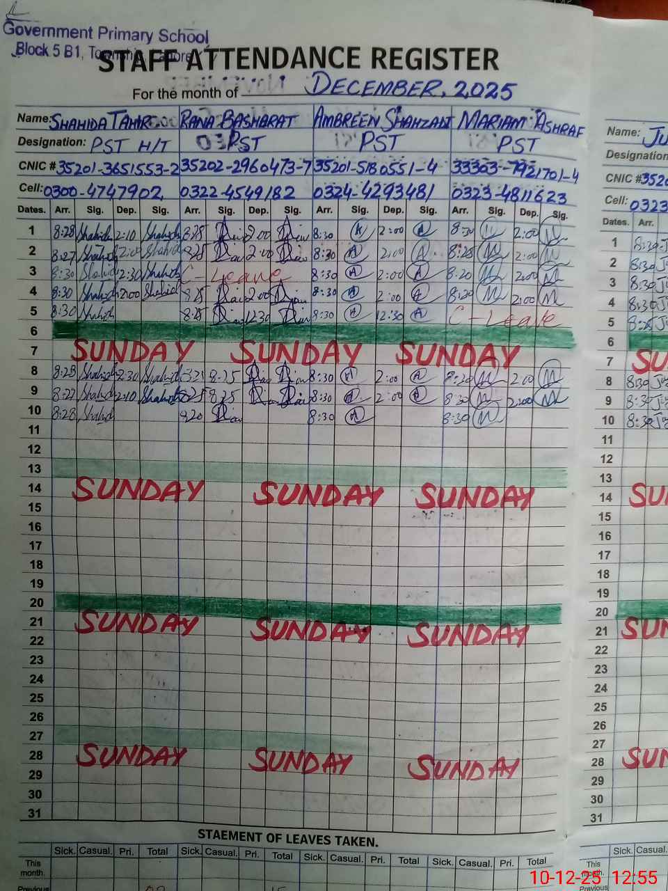 | CNIC | Full Name | Designation | R/C | Absence During Last Calender Month |
