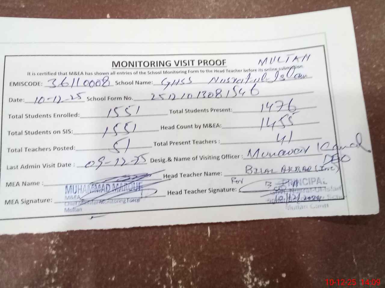 | Certified that this School was Inspected by the Undersigned MEA/DMO Today and the Information Stated Above is as Per Record. | |||||