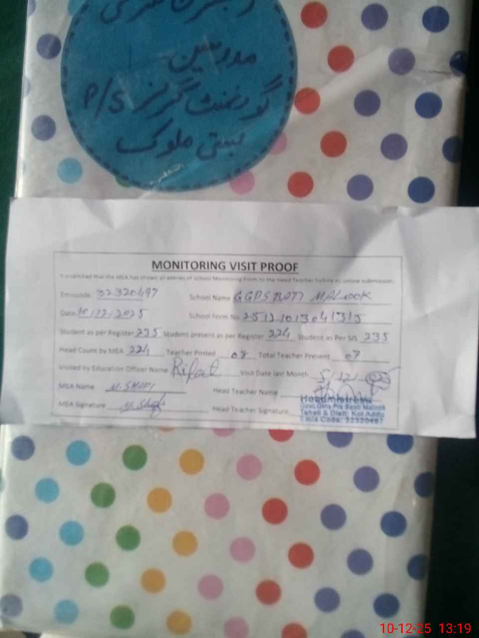 | Certified that this School was Inspected by the Undersigned MEA/DMO Today and the Information Stated Above is as Per Record. | |||||