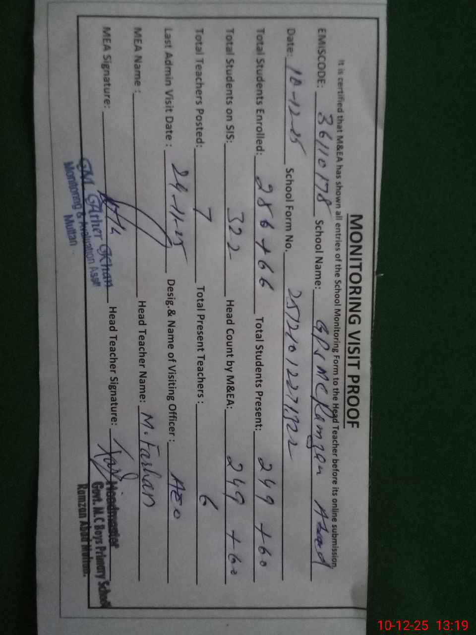 | EMIS Code: 36110178 | Name of School: GPS MC RAMZAN ABAD MULTAN | |||