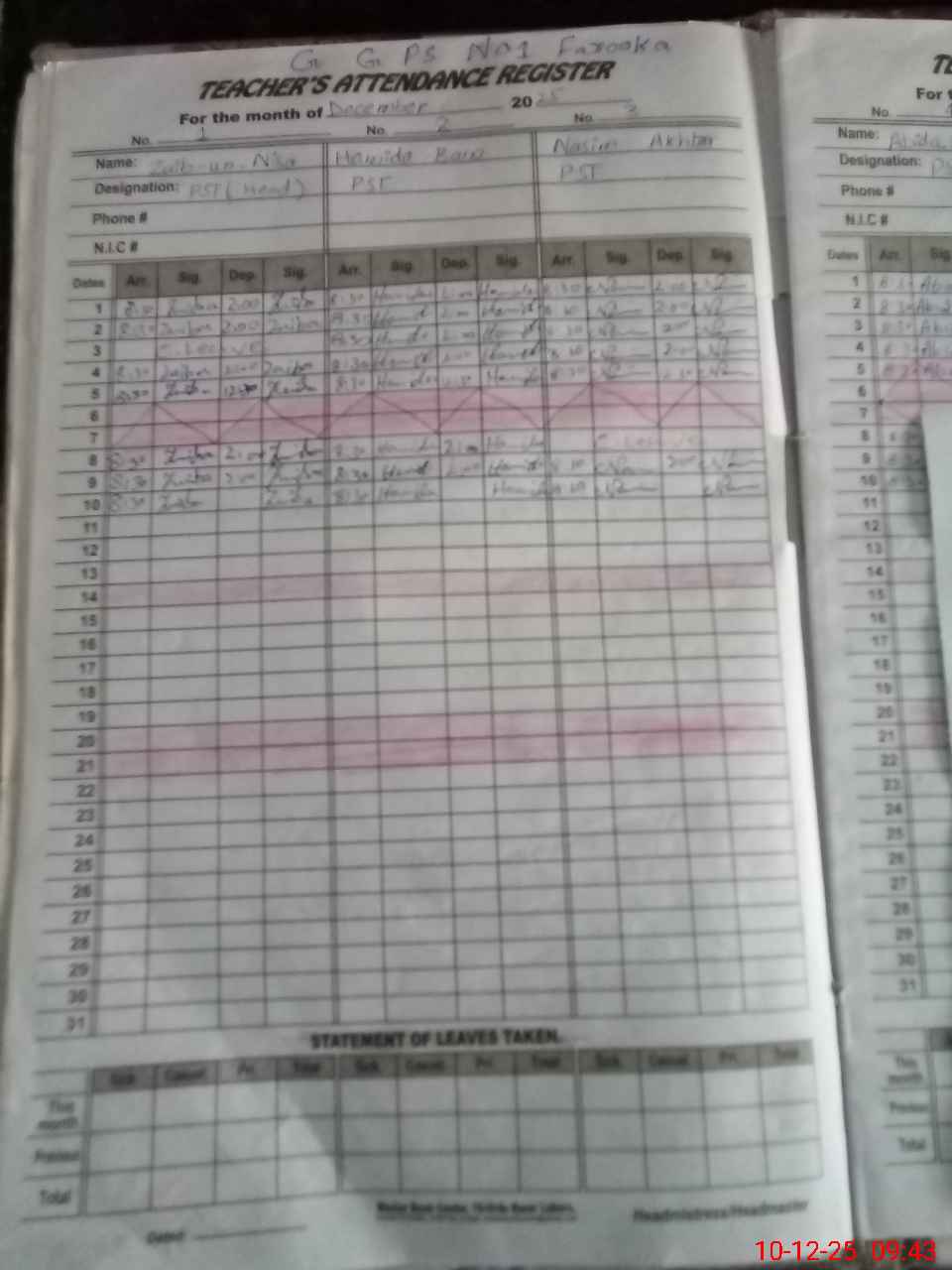 | CNIC | Full Name | Designation | R/C | Absence During Last Calender Month |