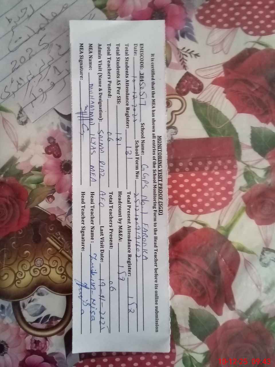 | Attendance Register | Head Teacher | MEA with School | Visit Proof |