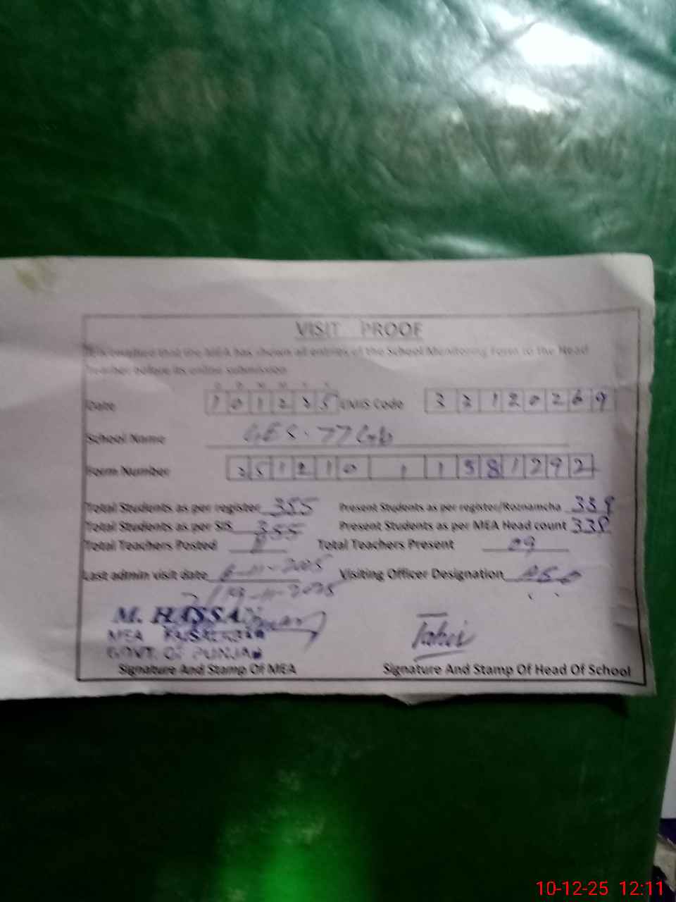 | Certified that this School was Inspected by the Undersigned MEA/DMO Today and the Information Stated Above is as Per Record. | |||||