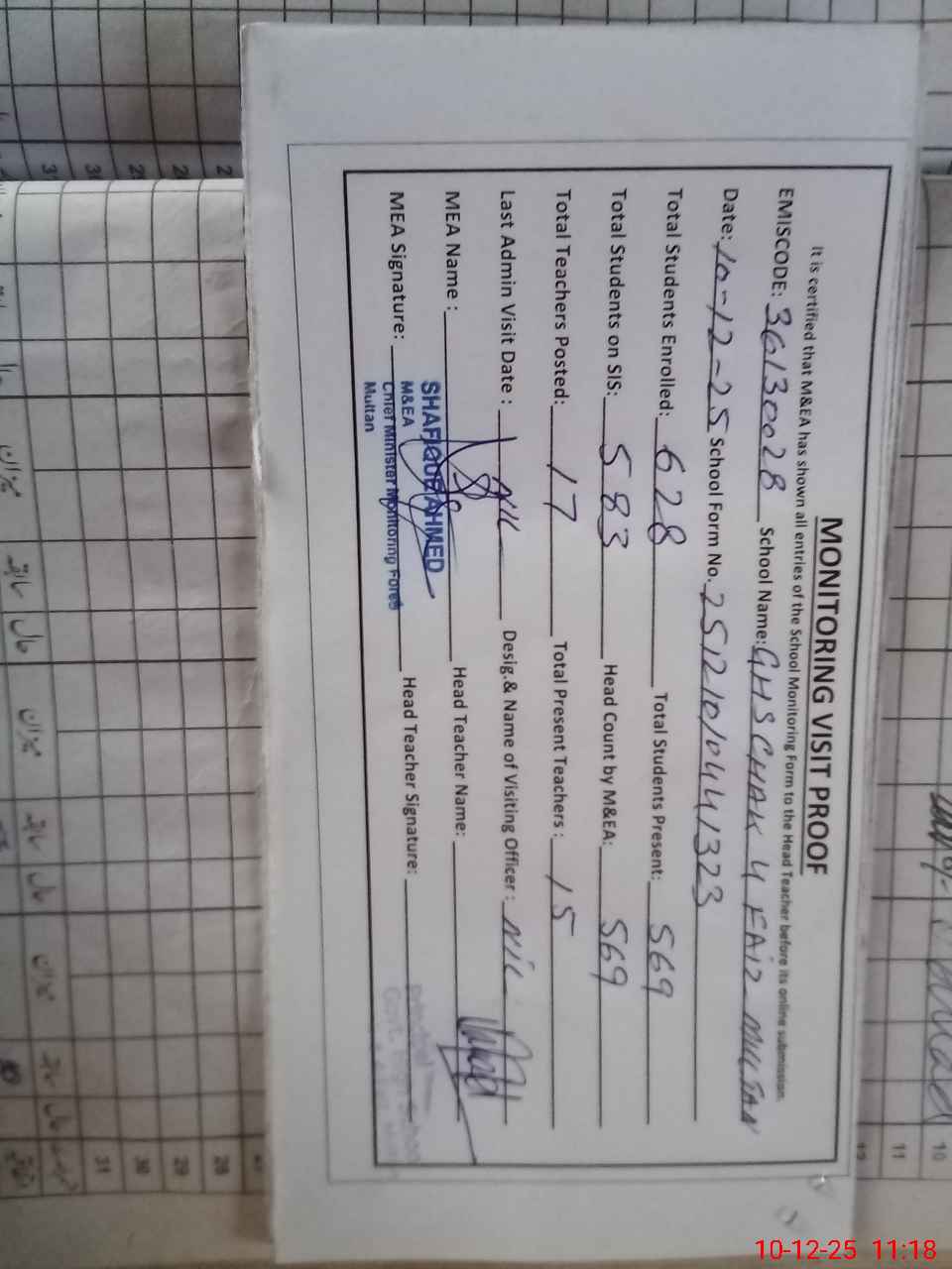 | EMIS Code: 36130028 | Name of School: GHS CHAK 4 FAIZ MULTAN | |||