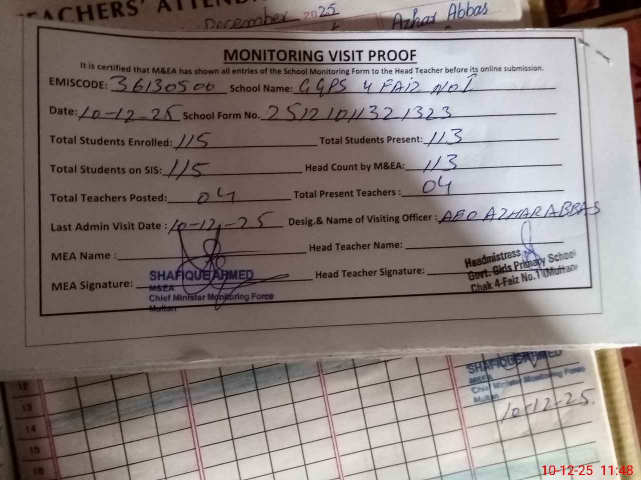 | Attendance Register | Head Teacher | MEA with School | Visit Proof |