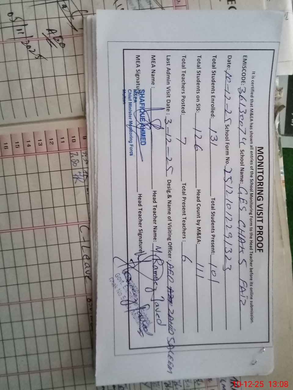 | Attendance Register | Head Teacher | MEA with School | Visit Proof |