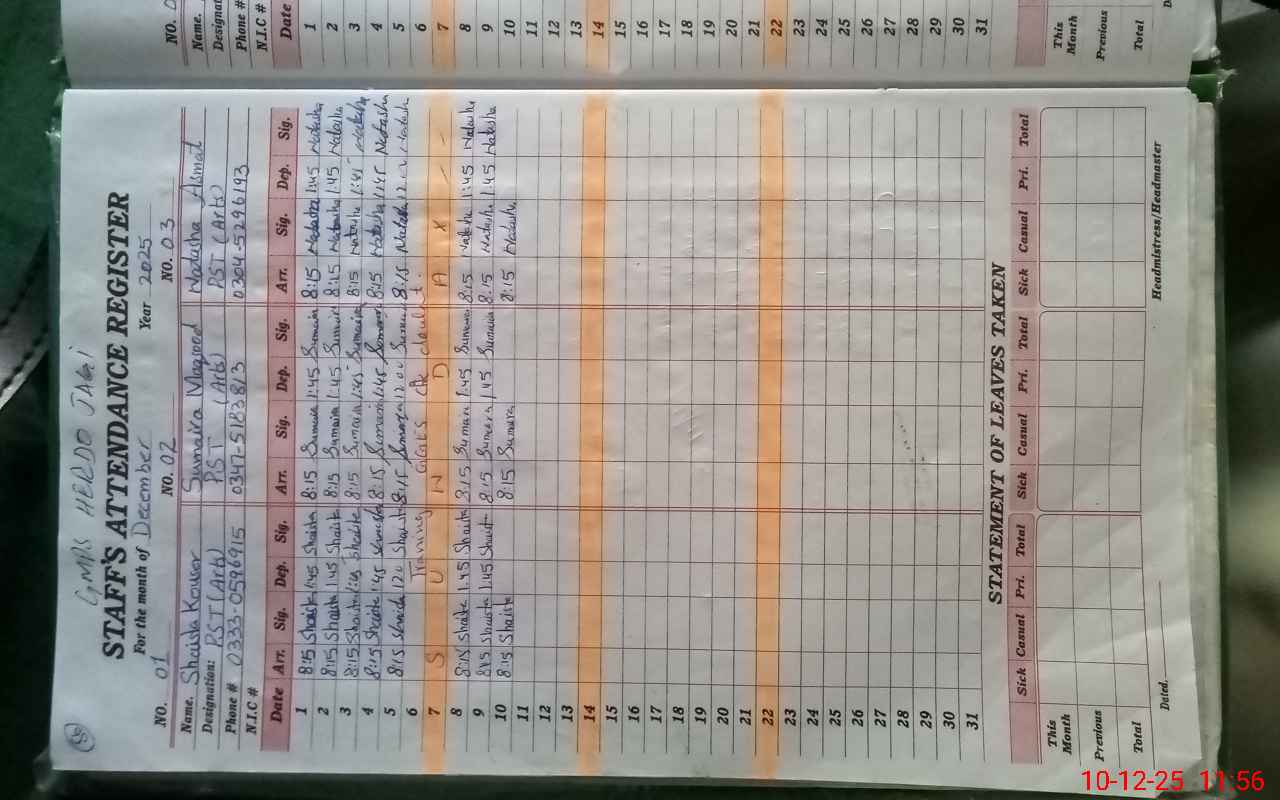 | CNIC | Full Name | Designation | R/C | Absence During Last Calender Month |