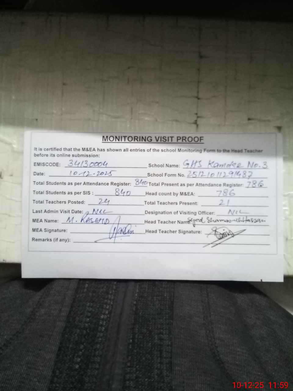 | Certified that this School was Inspected by the Undersigned MEA/DMO Today and the Information Stated Above is as Per Record. | |||||