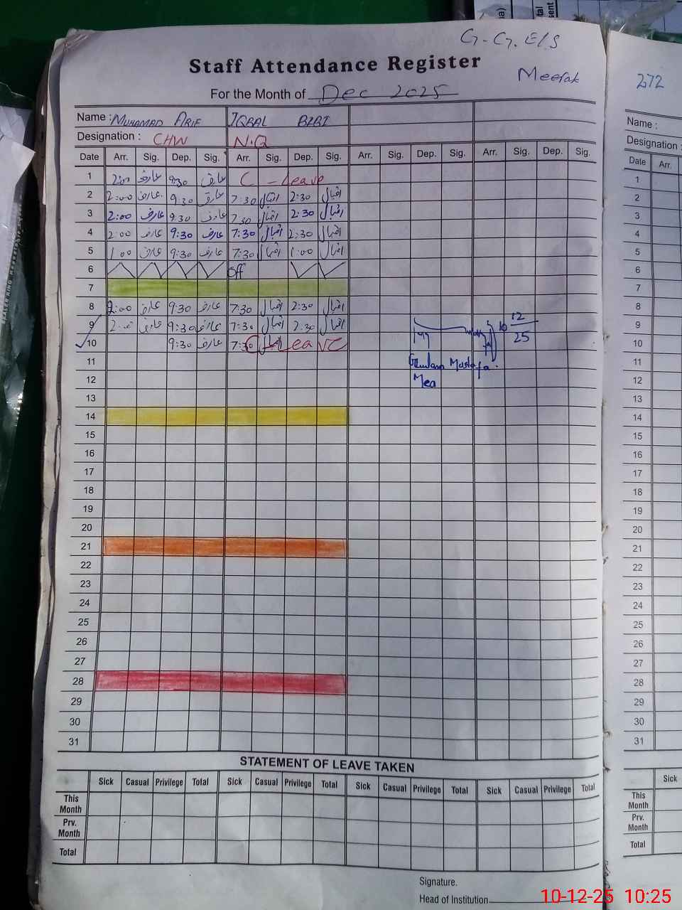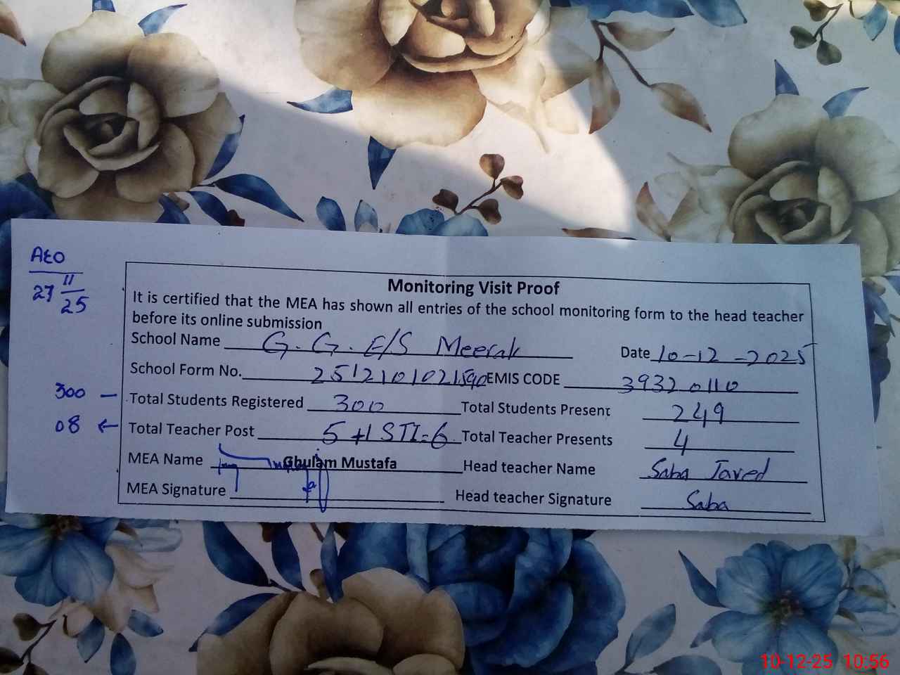 | Remarks (Use Separate Page if Required): Last visit by AEO is on 27.11.25 There are 02 feeder Teachers also appointed, due to non availability of NIC number their name could not entered in teaching staff column. 1. Farwa Noor 2. Ruqia Rustam Submitted for information please | |||||