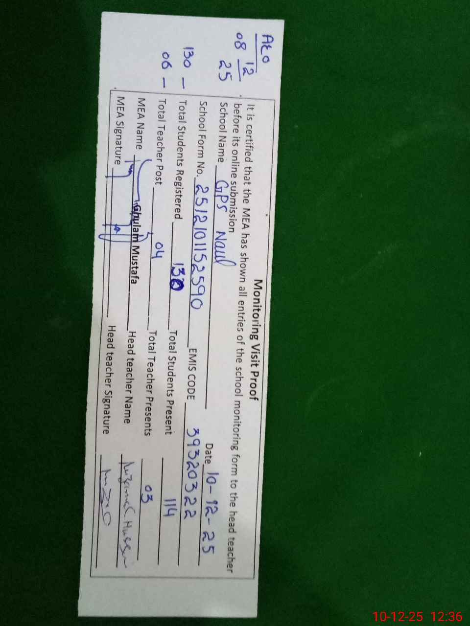 | Remarks (Use Separate Page if Required): Last visit by AEO on 08.12. 25 data for on line attendance found contrary to current students available in the class. | |||||