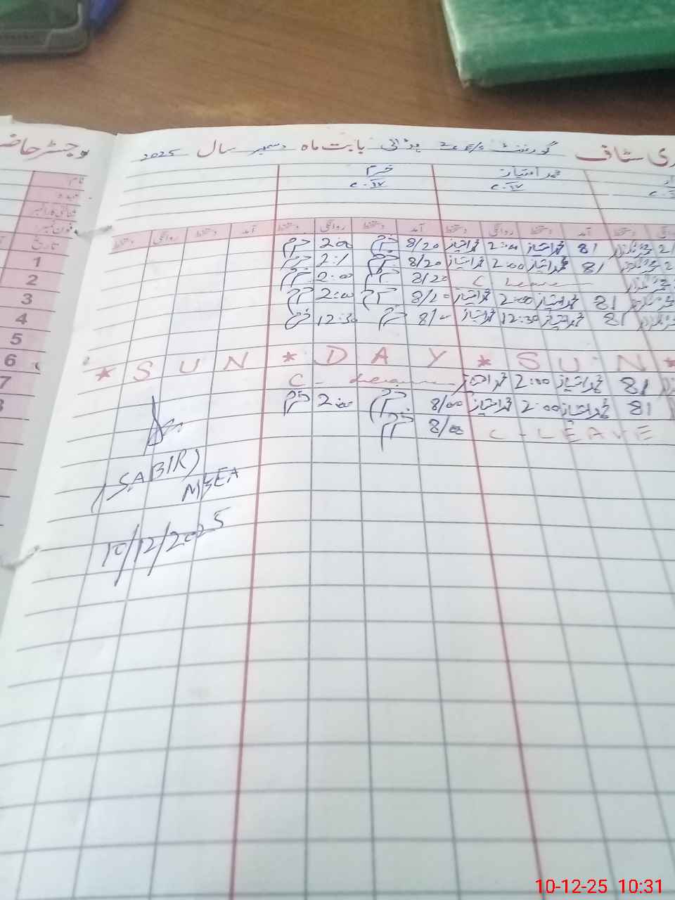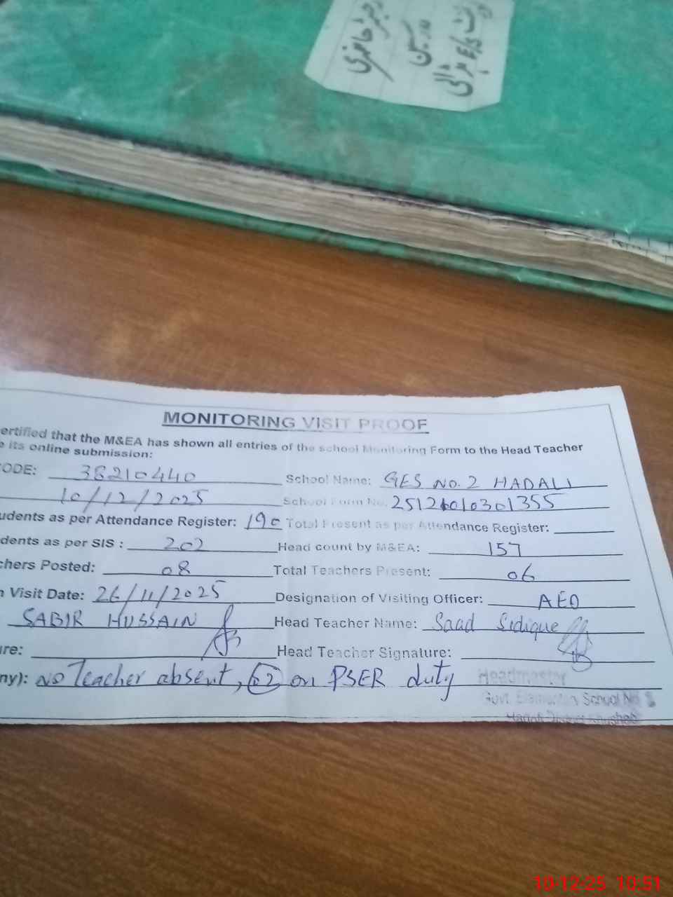 | Remarks (Use Separate Page if Required): no teacher absent total students on register 190 total students on SiS 202 present students 157 last admin visit by AEO on 26 Nov 2025 | |||||
