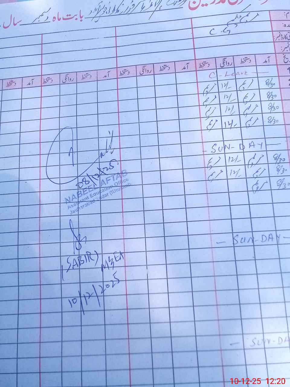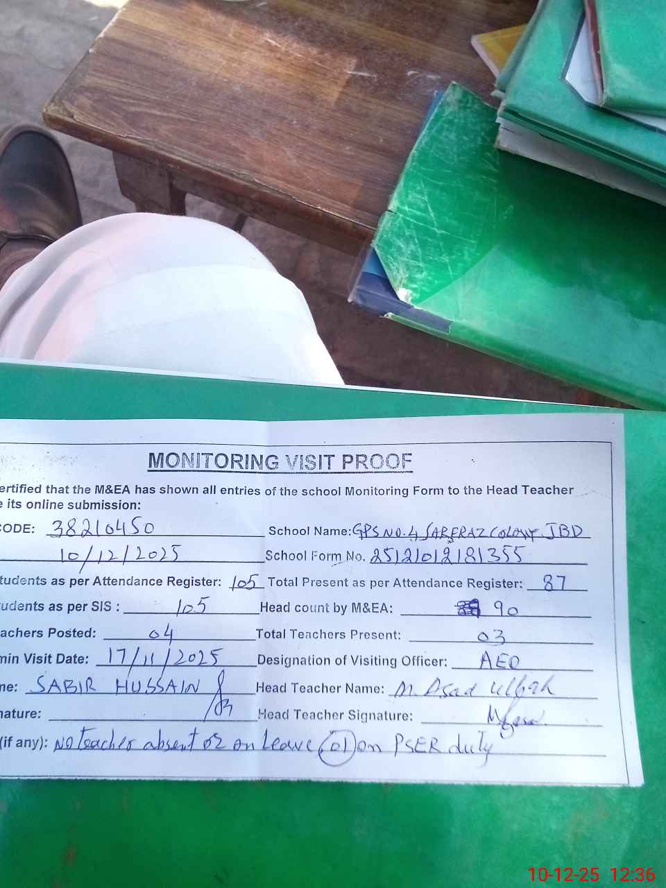 | Remarks (Use Separate Page if Required): no teacher absent total students on register 105 total students on SiS 105 present students are 90 last admin visit by AEO on 08 Dec 2025 | |||||