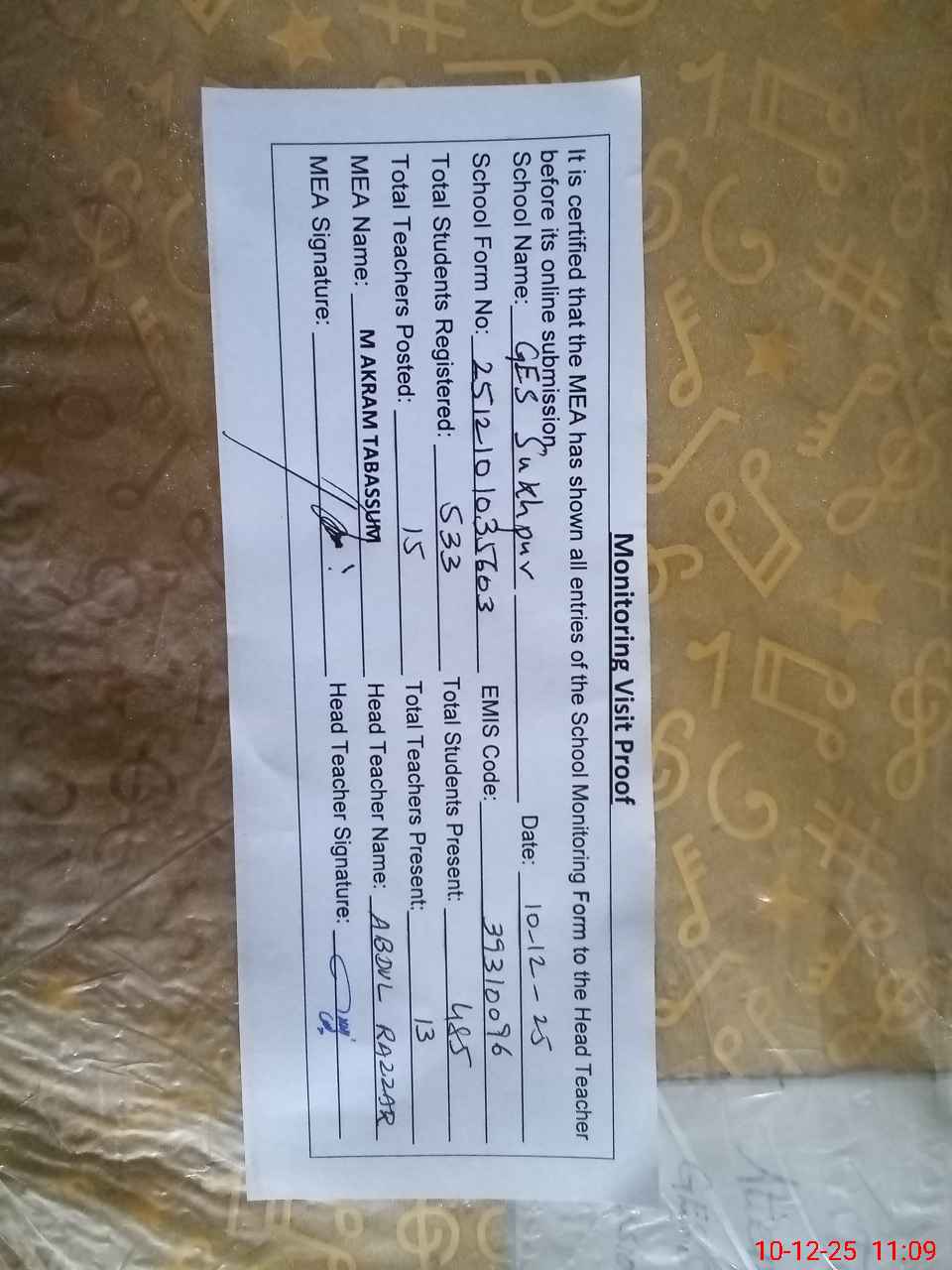 | Attendance Register | Head Teacher | MEA with School | Visit Proof |