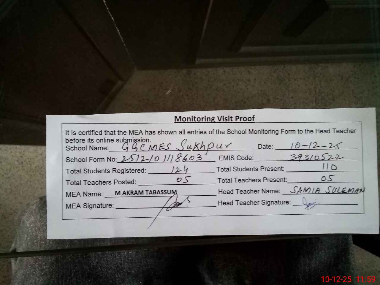 | Attendance Register | Head Teacher | MEA with School | Visit Proof |