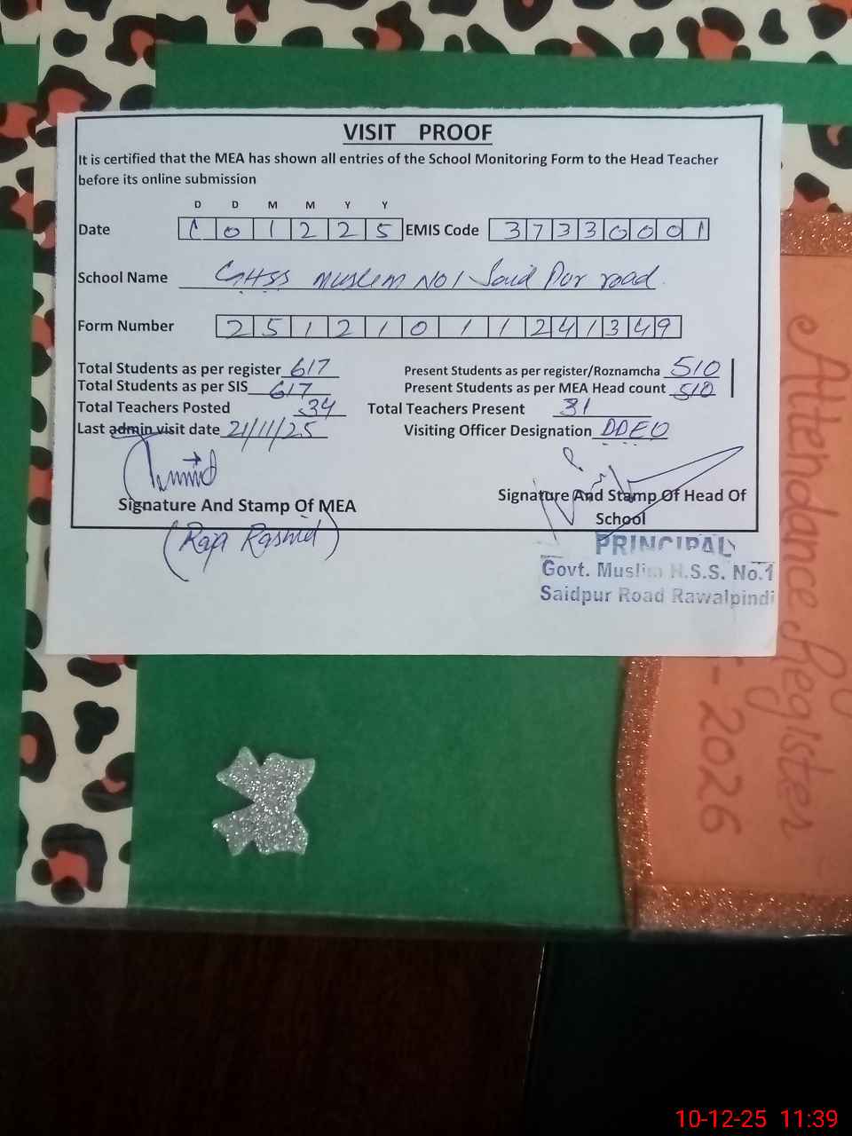 | Attendance Register | Head Teacher | MEA with School | Visit Proof |