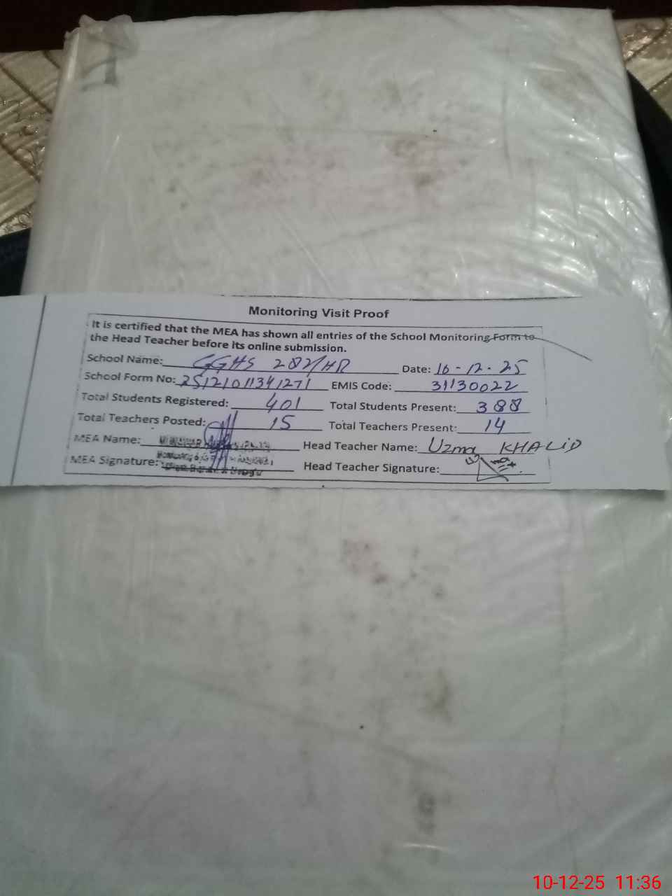 | EMIS Code: 31130022 | Name of School: GGHS CHAK NO 282 HR | |||
