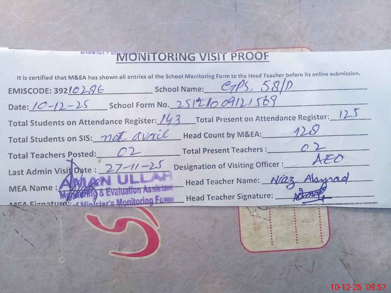 | Attendance Register | Head Teacher | MEA with School | Visit Proof |