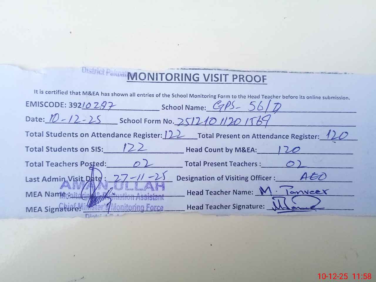 | Attendance Register | Head Teacher | MEA with School | Visit Proof |