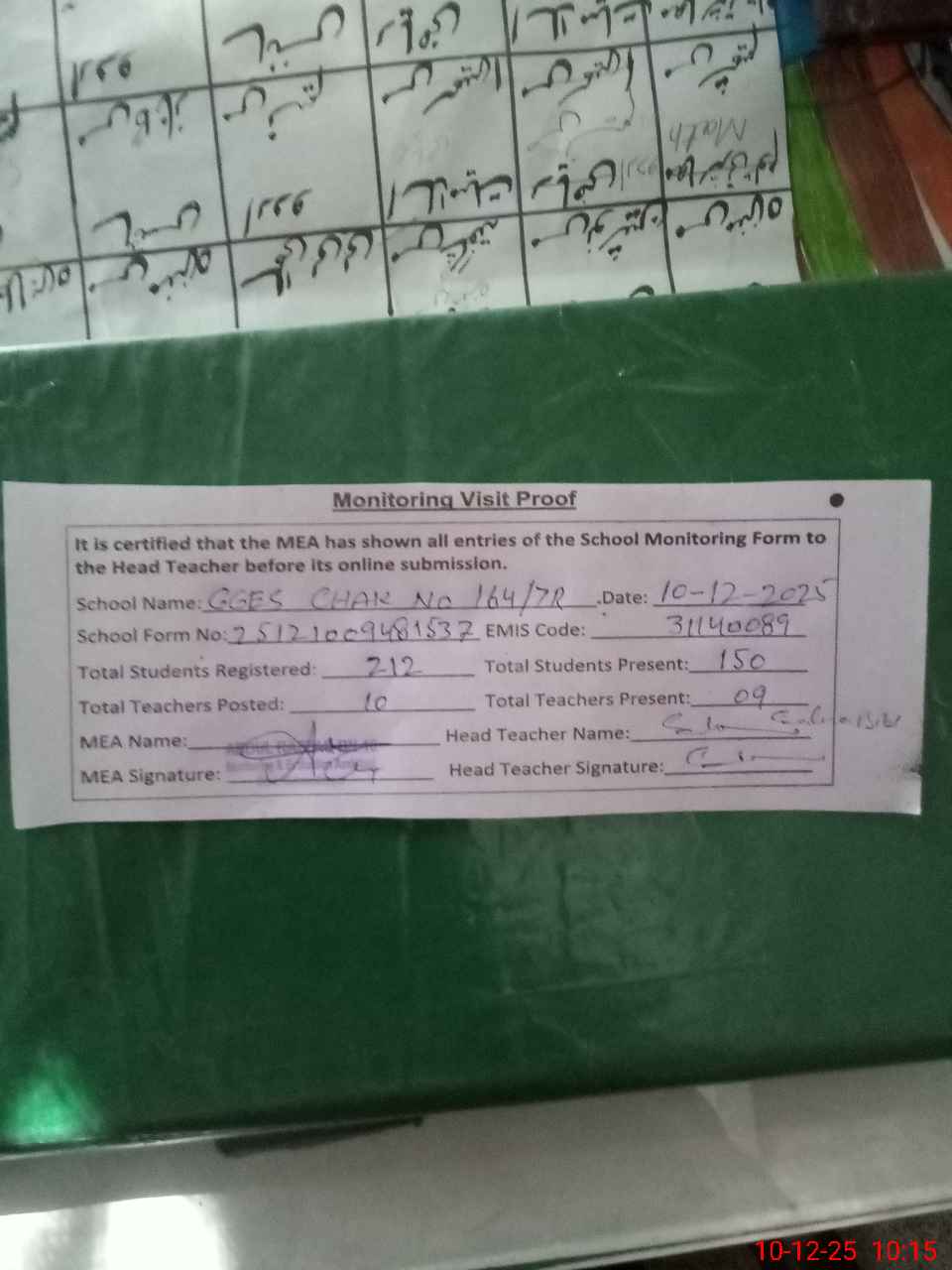 | Attendance Register | Head Teacher | MEA with School | Visit Proof |