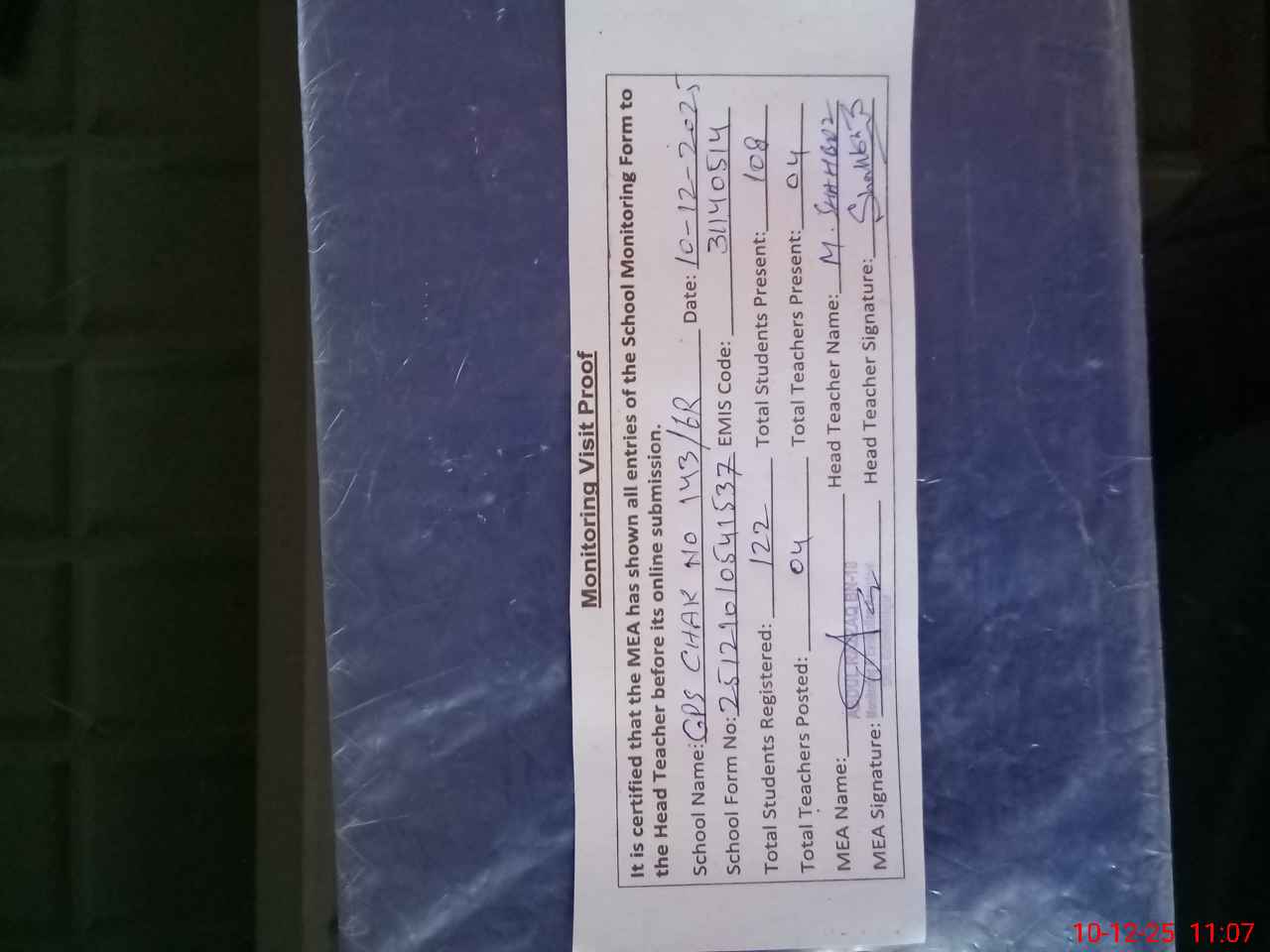 | Attendance Register | Head Teacher | MEA with School | Visit Proof |