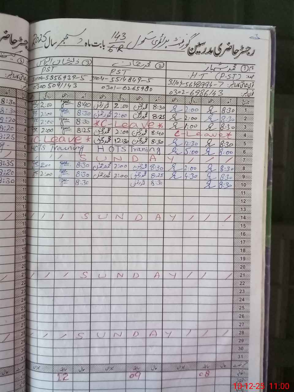 | CNIC | Full Name | Designation | R/C | Absence during last cal. month |
