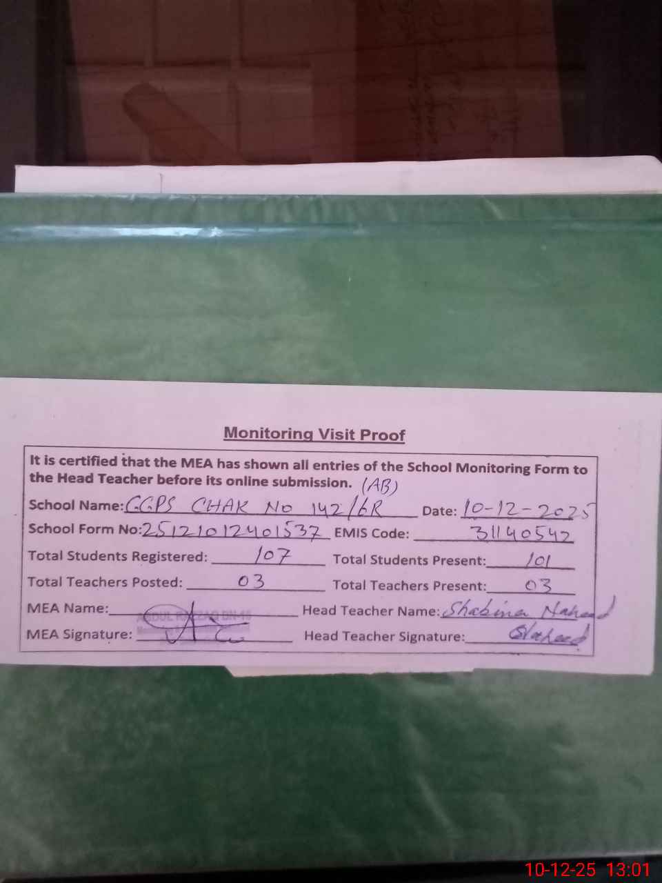 | Attendance Register | Head Teacher | MEA with School | Visit Proof |