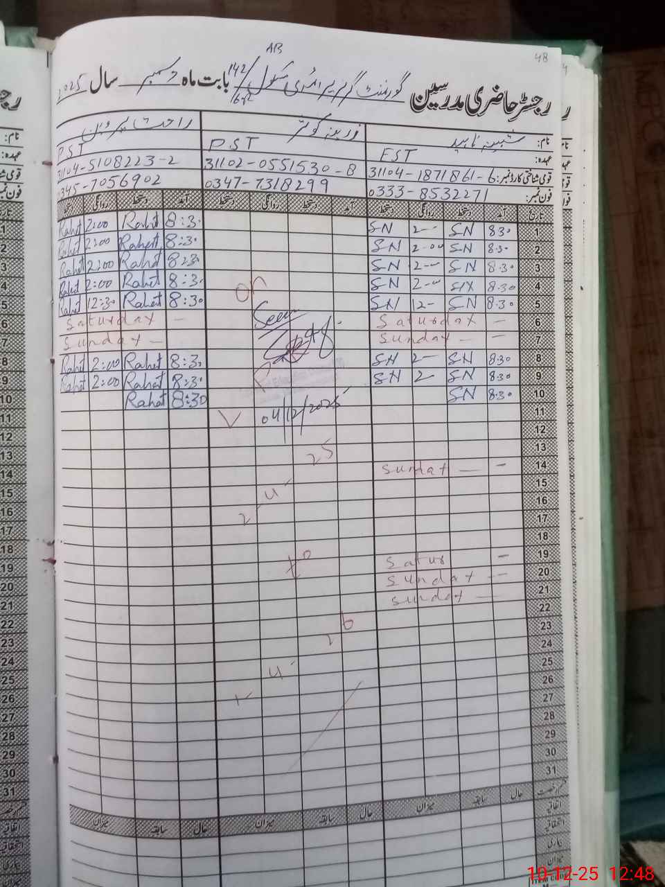 | CNIC | Full Name | Designation | R/C | Absence During Last Calender Month |