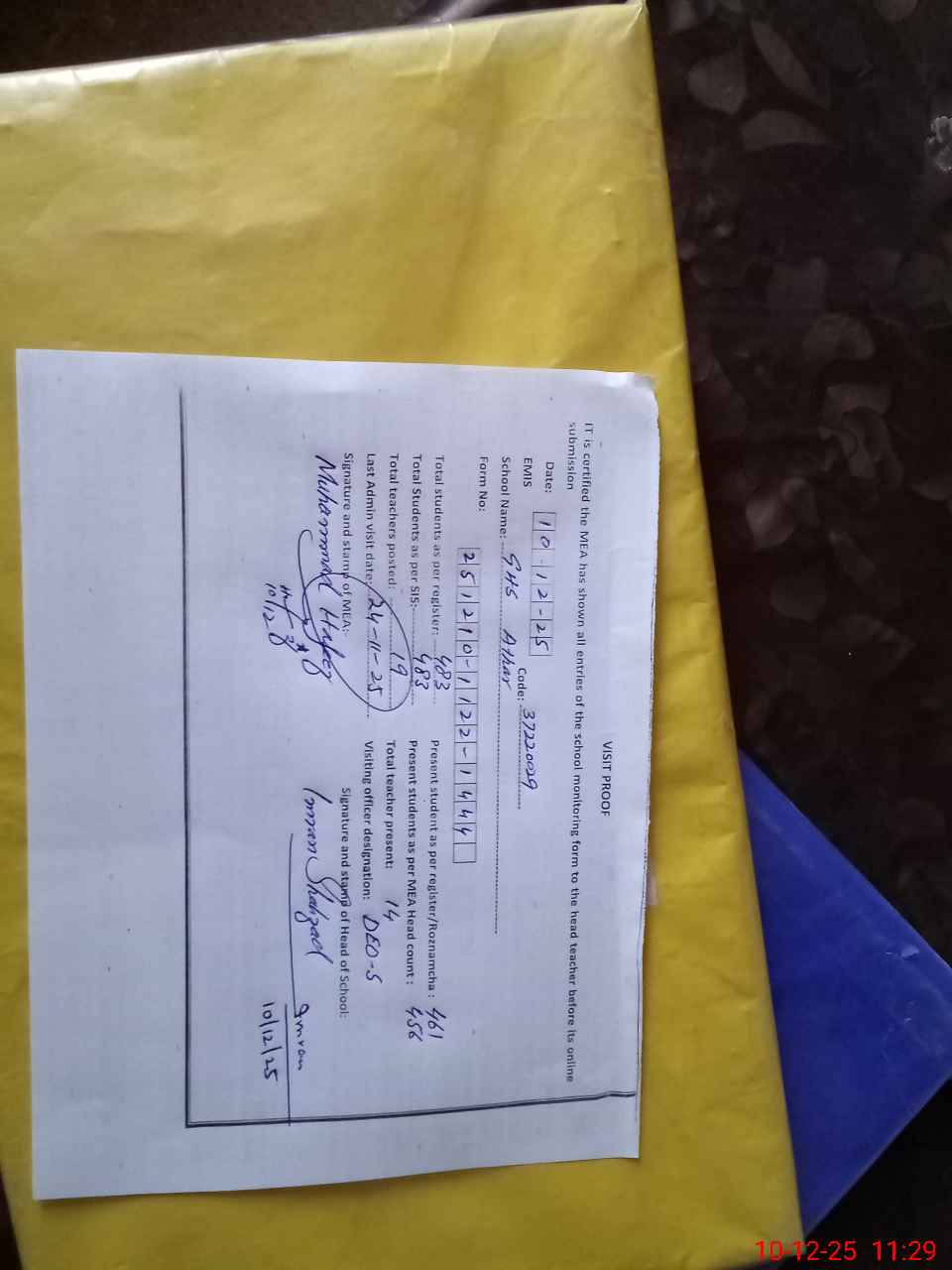 | Remarks (Use Separate Page if Required): Sir. Headmaster (HM) Ishfaq Ahmed not present in school his leave not approved from higher authority when seen on SIS his leave still on waiting at 1100 hrs on 10-12-25 Headmaster apply leave on 9-12-25 . He not seen higher authority reply and not come to school consider absent. All Classes are sitting on mud ground. Students dress was very dirty picture are available. Physically head count and on students attendance register are difference picture are available. | |||||
