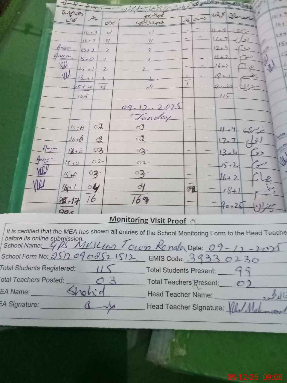 | Attendance Register | Head Teacher | MEA with School | Visit Proof |