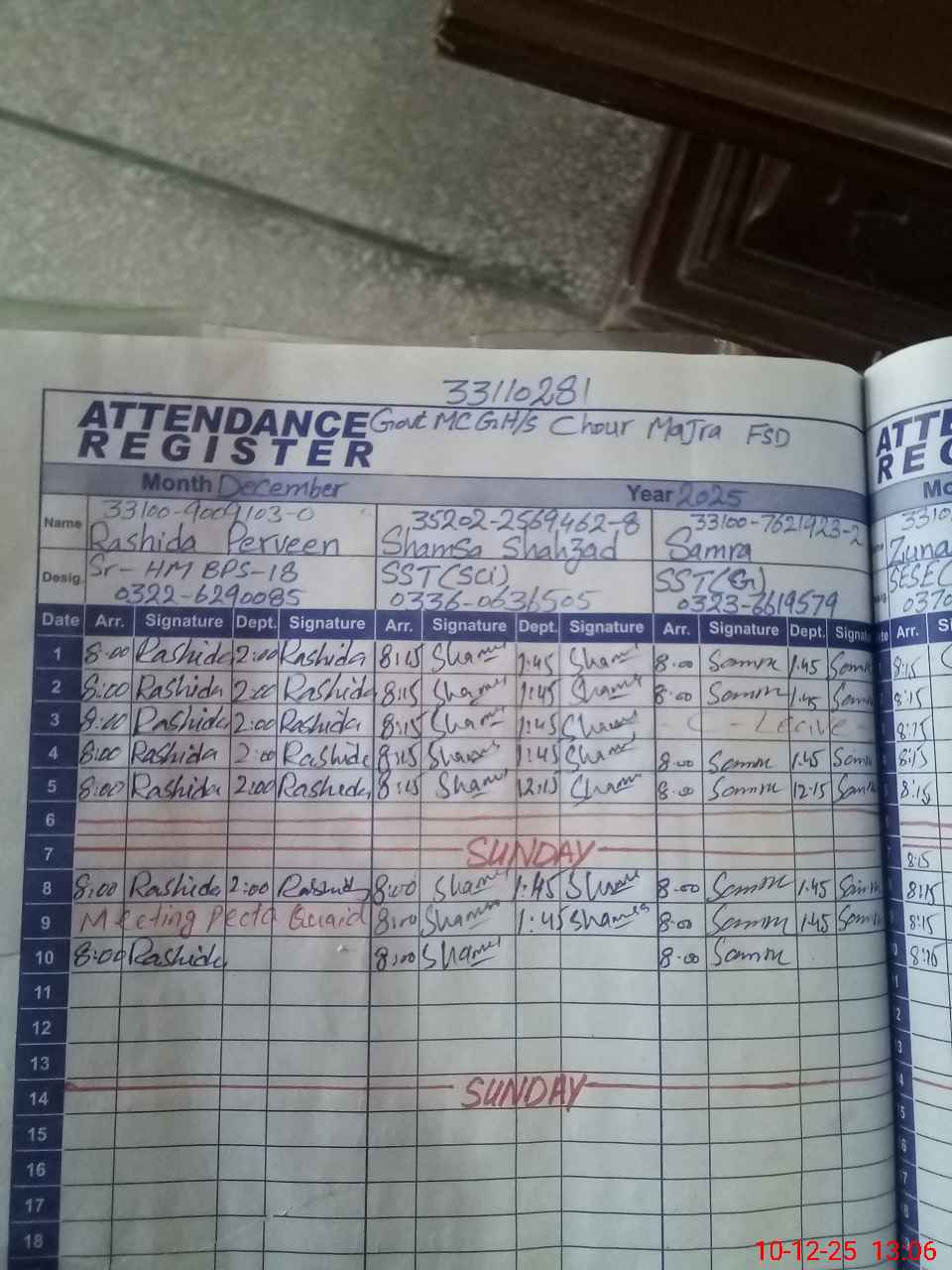 | CNIC | Full Name | Designation | R/C | Absence During Last Calender Month |