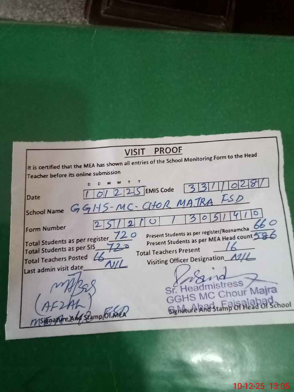 | Attendance Register | Head Teacher | MEA with School | Visit Proof |