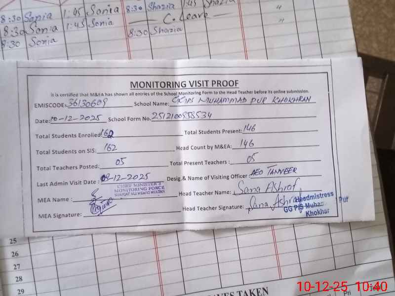 | EMIS Code: 36130609 | Name of School: GGPS MUHAMMAD PUR KHOKHAR | |||