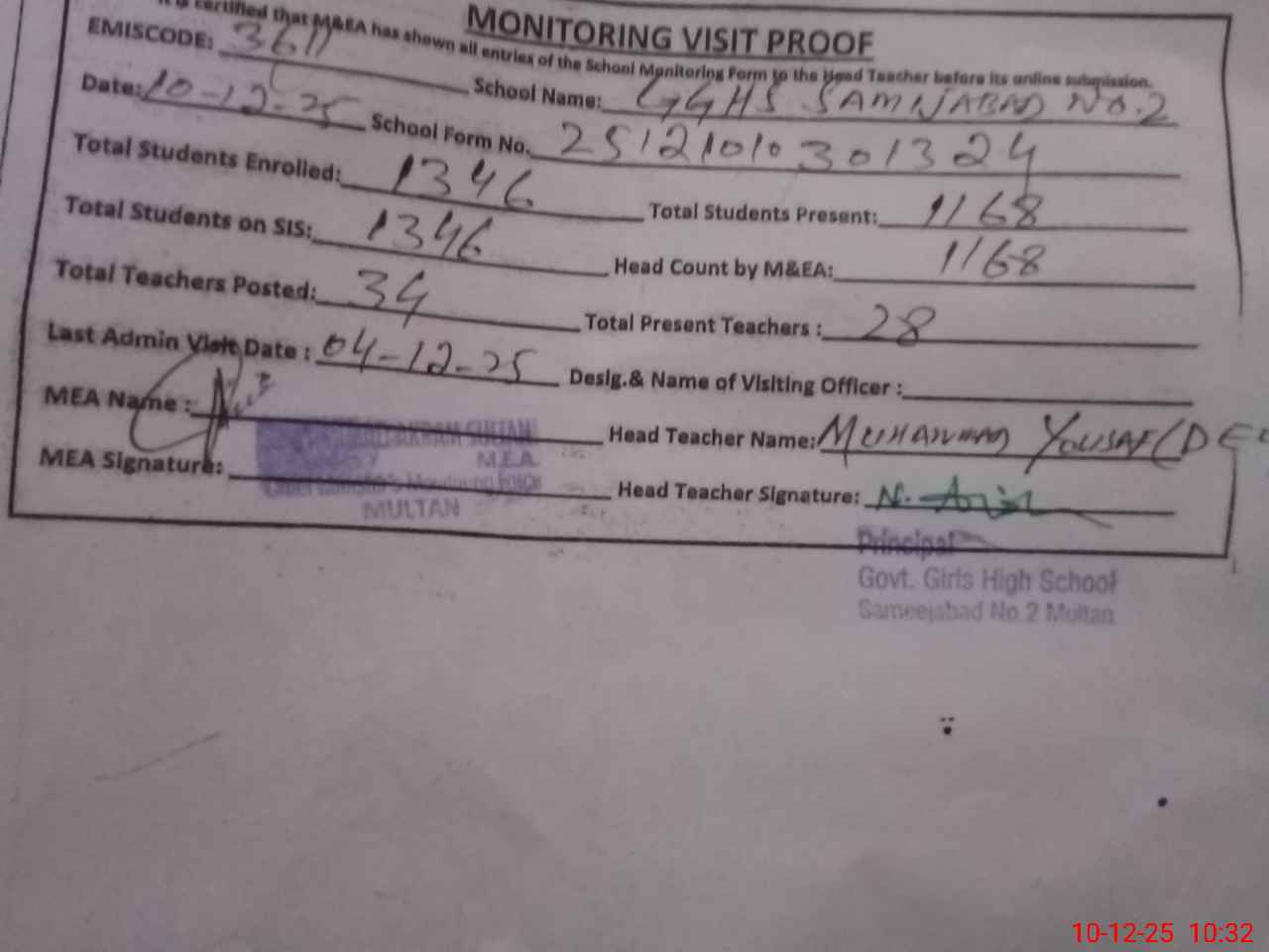 | Attendance Register | Head Teacher | MEA with School | Visit Proof |
