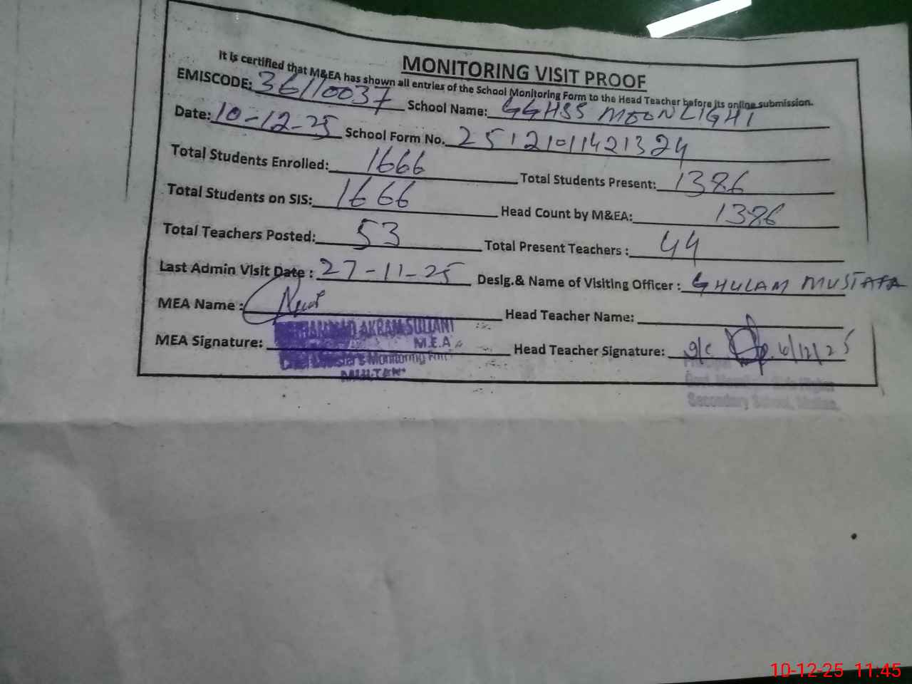 | Attendance Register | Head Teacher | MEA with School | Visit Proof |