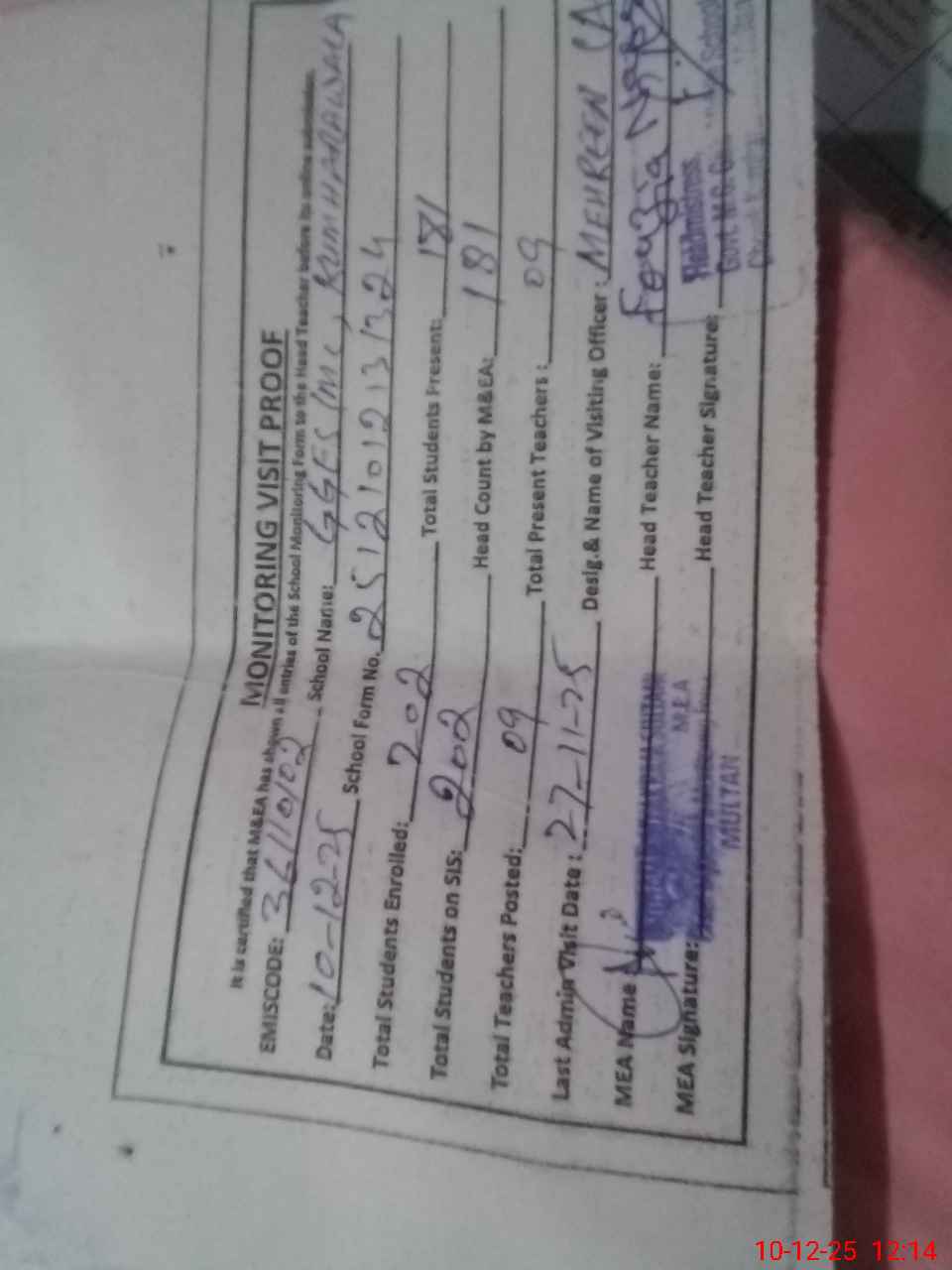 | Attendance Register | Head Teacher | MEA with School | Visit Proof |