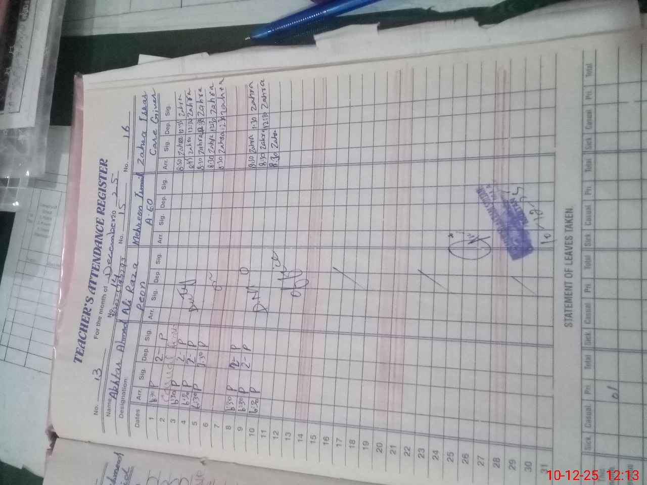 | CNIC | Full Name | Designation | R/C | Absence During Last Calender Month |