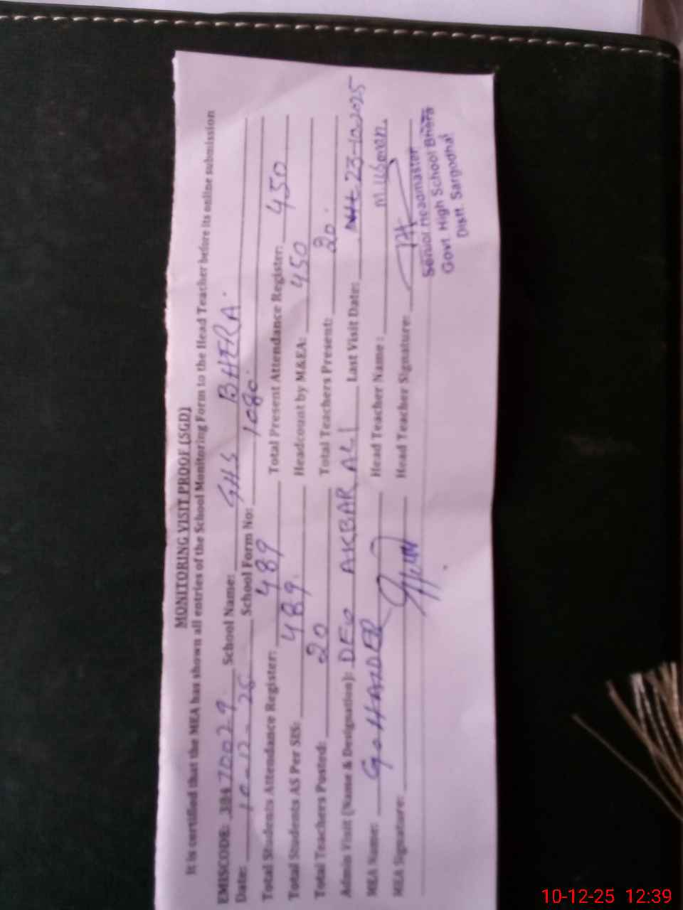 | Certified that this School was Inspected by the Undersigned MEA/DMO Today and the Information Stated Above is as Per Record. | |||||