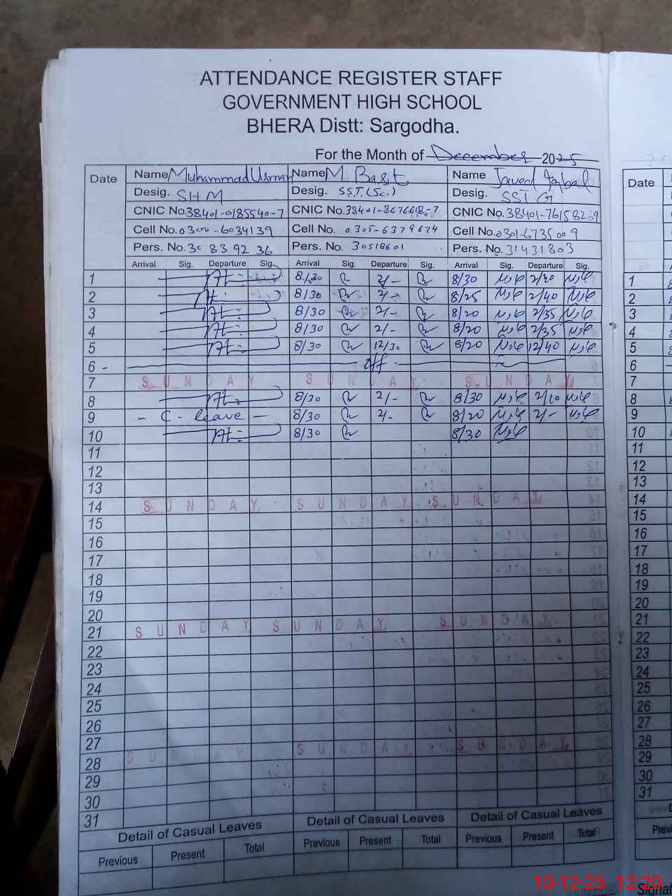 | CNIC | Full Name | Designation | R/C | Absence during last cal. month |
