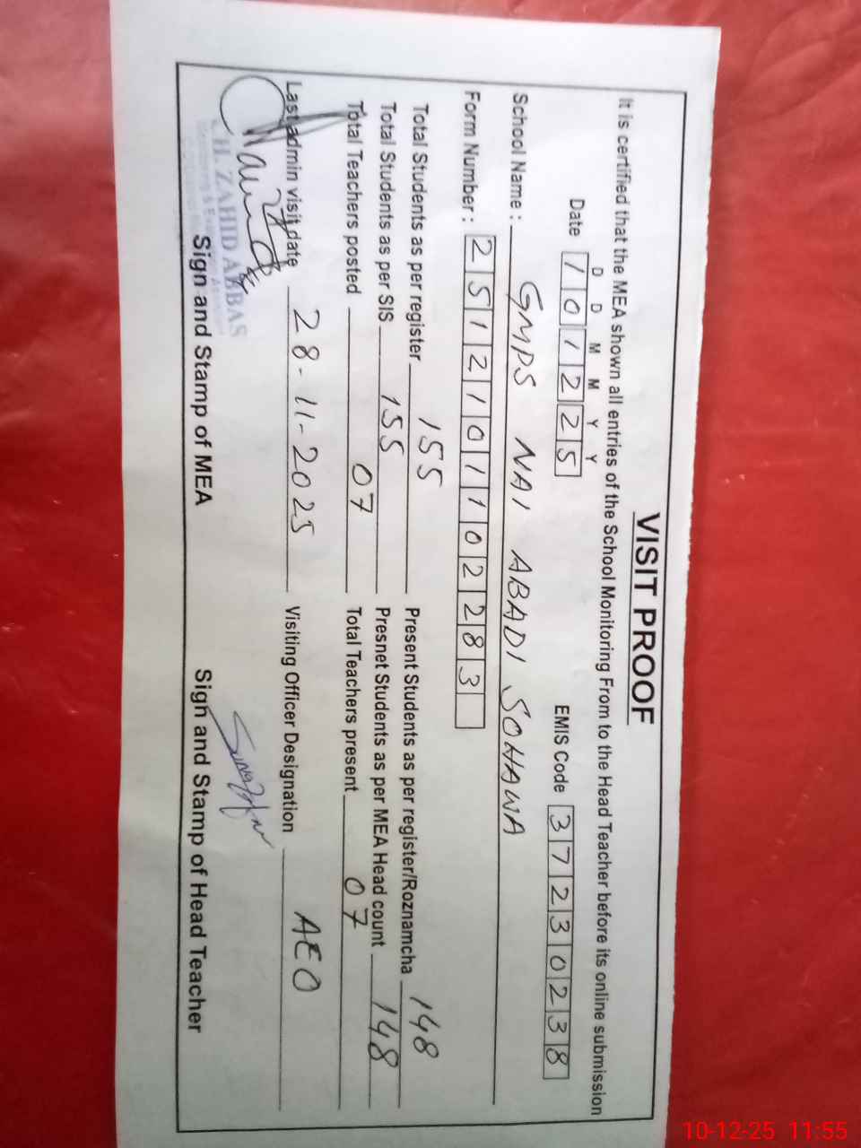 | Certified that this School was Inspected by the Undersigned MEA/DMO Today and the Information Stated Above is as Per Record. | |||||