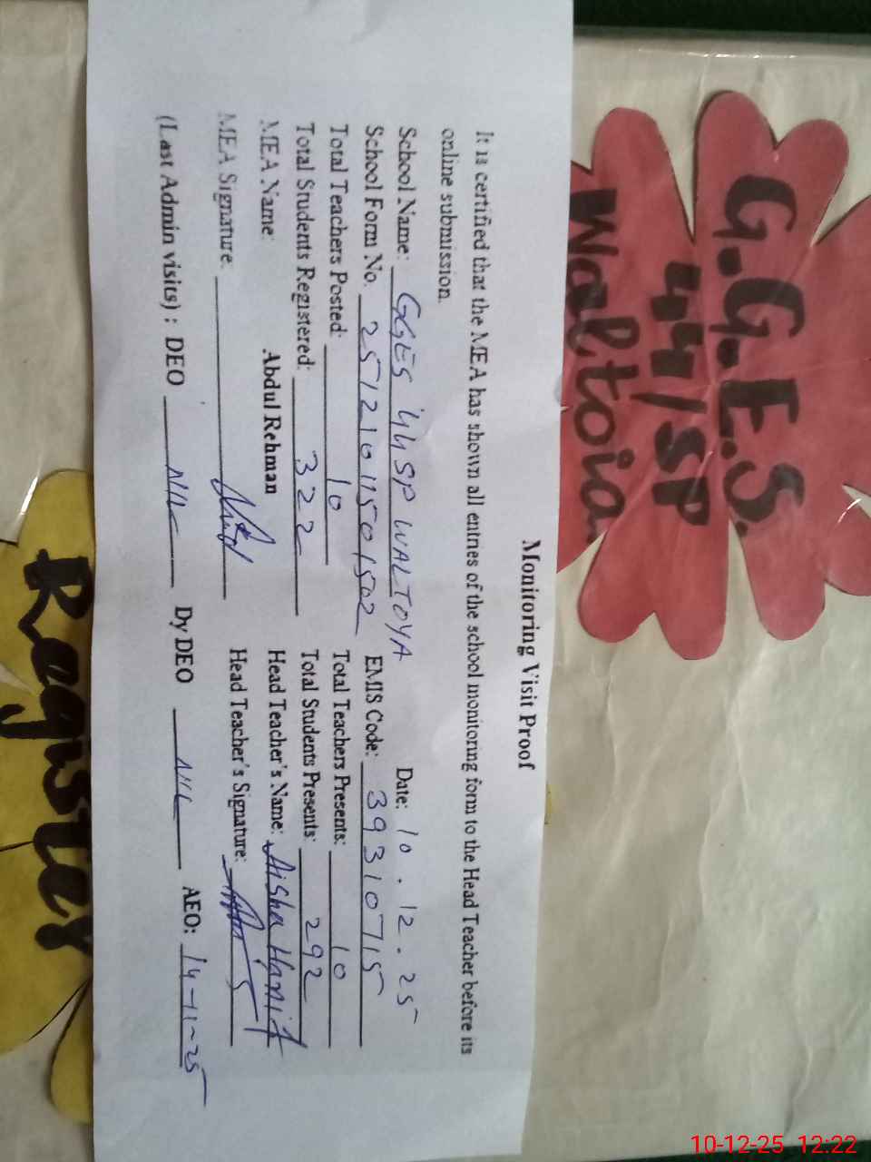 | EMIS Code: 39310715 | Name of School: GGES CHAK NO. 44/SP WALTOYA | |||