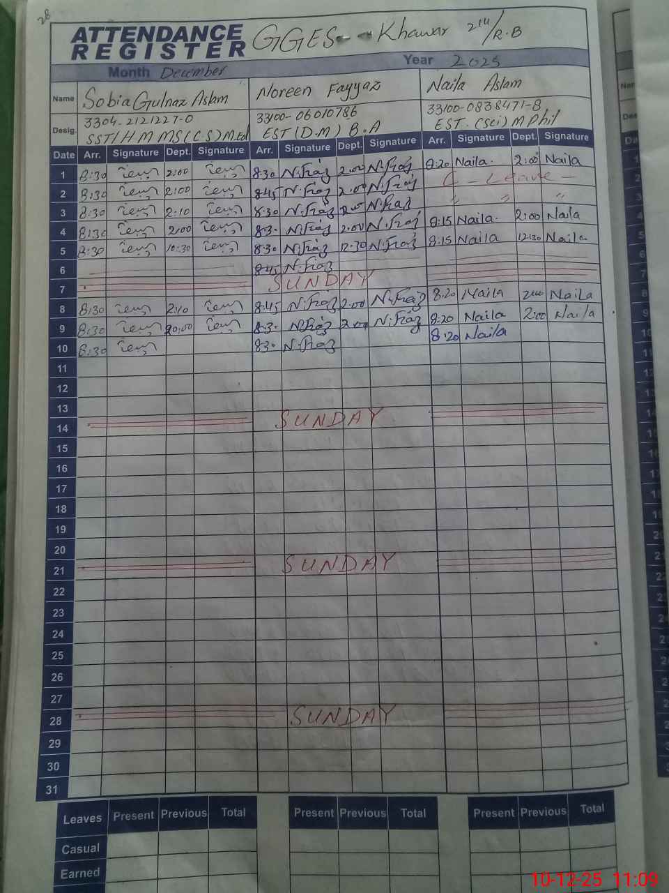 | CNIC | Full Name | Designation | R/C | Absence During Last Calender Month |