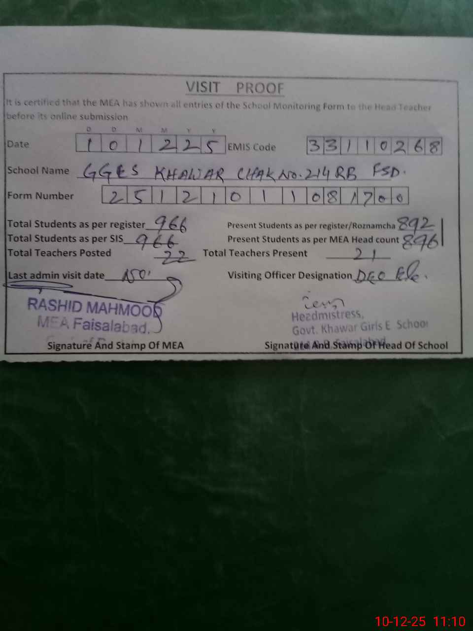 | Certified that this School was Inspected by the Undersigned MEA/DMO Today and the Information Stated Above is as Per Record. | |||||
